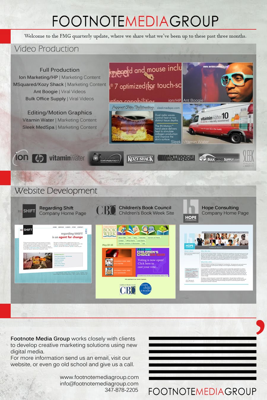 Footnote Media Group (FMG) is a online marketing agency based in New York City. FMG specializes in Search Engine Optimization, Search Engine Marketing, Social Media Marketing, Website Design and Video Production.